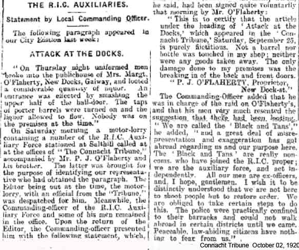 1920 Oct 2. Connacht Tribune carries a statement by "the commander of D Coy" who says "we are the auxiliary force, and act independently. All our men are ex-officers and I hope gentlemen. I wish it to be distinctly understood that we are not here to shoot people, but to restore order. We are obliged to take certain steps to do this...Peaceable, law abiding citizens have nothing to fear from us."
