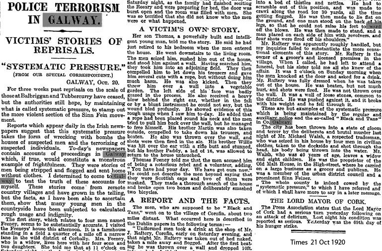 1920 Oct 17. Mr J Raftery of Corofin was flogged and beaten Times report .