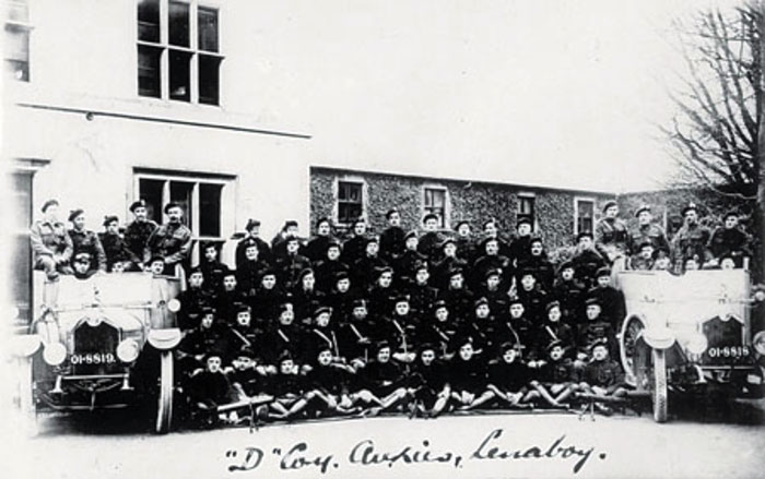 1920 Aug 3. D Company formed initially at The Curragh, then moved to in Galway. D Coy. They first appear at Annagh House on 6 Sep 1920. They appear to have moved into the Retreat on Revagh Road in Salthill,Galway in late September 1920 and appear to have been based from October 1920 in Lenaboy Castle, Taylor’s Hill on the outskirts of Galway City. They also used Drumharsna Castle as a post, for how many Auxiliaries I do not know, the only references to its use by the Auxiliaries come in accounts of the murder of the Loughnane brothers at the end of Nov 1920. That says that they were under orders to move out of Drumharsna on 27 Nov 1920, but that the Loughnane incident resulted in them getting orders to stay on. . Today Drumharsna Castle is a gaunt ruin. A large house stood next to it until it was demolished in 1920s.