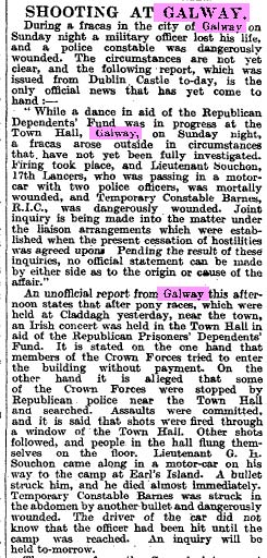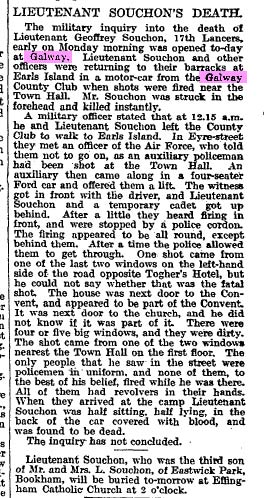 1921 Oct 2. Lt G H Souchon of the 17th Lancers was on his way from his Club to Earl’s Island Army Camp in Galway. On his way he met some fellow officers who gave him a lift in their car. As they drove passed the Town Hall shots were fired and Lieutenant Souchon was hit in the head, he died instantly.