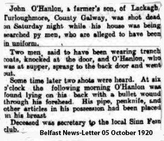 1920 Oct 5. Auxiliaries raid the farmhouse of William O'Hanlon near Turloughmore, and shot his son John O'Hanlon, Secretary of the local Sinn Fein Club