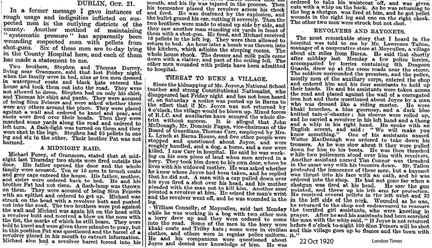 1920 Oct 15 Durrey brothers at Oranmore were peppered by shotgun blasts by about 12 armed raiders Times report