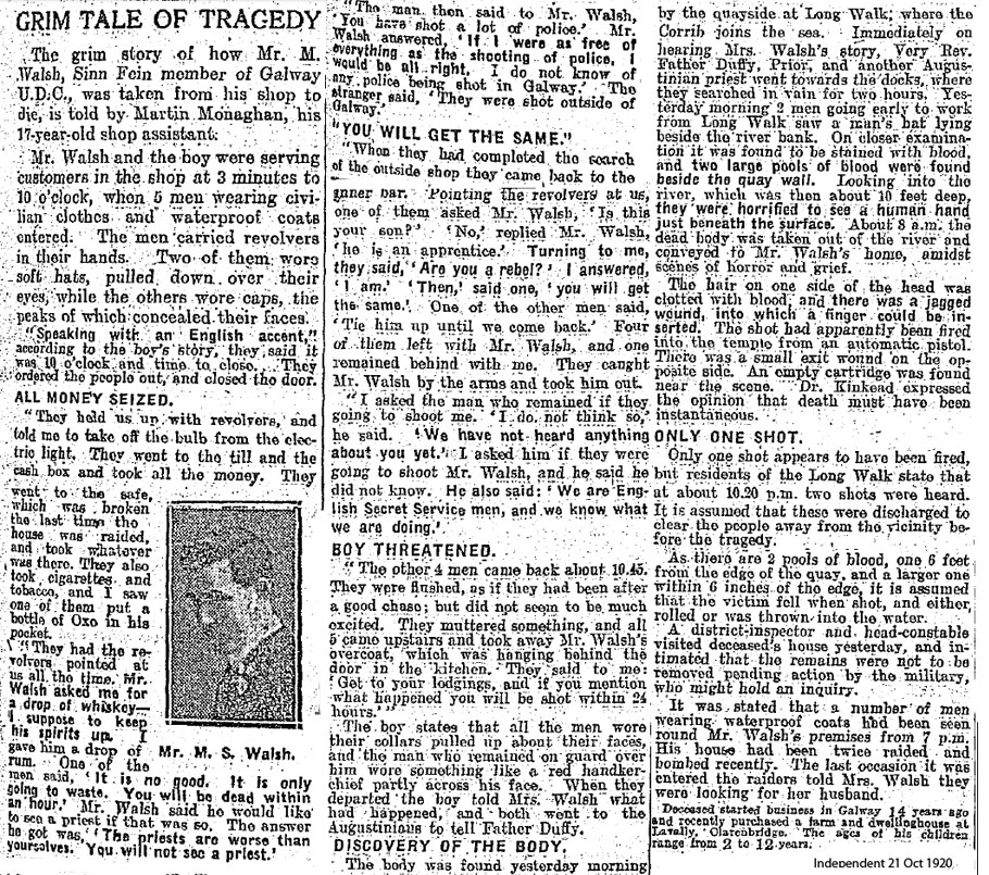 The same night 5 men with English accents walked into Michael Walsh's pub in Galway town. They wore plain clothes and carried revolvers. They took Walsh and his assistant Martin Meenaghan outside. They shot Walsh in the head and pushed his body into the dock. Meenaghan was let go. Michael Walsh was aged about 40 and had 8 children (He is in 1911 census, then aged 33, at 16 High St, and a shopkeeper) Times report t & Independent report