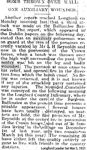 1921 Feb 28. Sentry wounded at Ballinalee - the wounded man appears to be a Black & Tan, and nothing to do with ADRIC