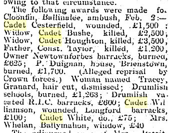 1921 Feb 3. Clonfin Ambush , two lorries carrying 17 Auxiliaries were driving between Granard and Ballinalee. The Longford Flying Column under Sean McEoin had prepared to ambush them at Clonfin. The IRA exploded a mine under the first lorry, wounding all the Auxiliaries in that lorry and killing the driver. The second lorry ran into the ambush and its occupants were attacked by the IRA. The Auxiliaries surrendered when their ammunition ran out. McEoin gave orders that the wounded were to be cared for and that survivors should not be executed. One of the Auxiliaries (it appears to have been Richardson) got away and managed to summon reinforcements. Four Auxiliaries are killed (DI Francis Craven, Cadet George Bush, Cadet Harold Clayton and Cadet John Houghton and eight wounded. After the Auxiliaries surrendered, MacEoin allowed the wounded to get medical treatment.