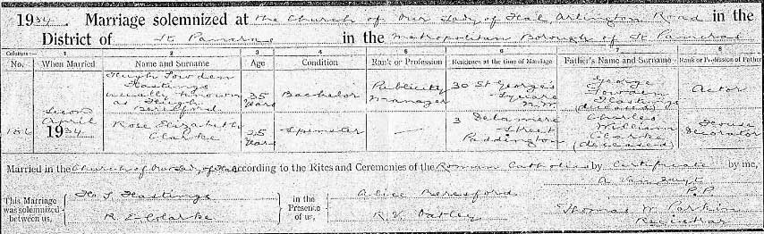 1934 Jun Married in London to Rose Elizabeth Clarke (the marriage shows him as both Hugh J Beresford and Hugh S Hastings) The birth cert of Rose gives her birth date 2 Jan 1909 which is the same as given on her ( Rose Elizabeth Beresford ) death cert index.