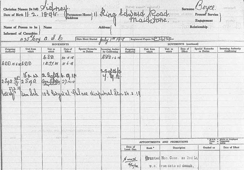 1919 Feb 25. The undermentioned Cadets are granted hon. commissions as 2nd Lts.:S/014637 S. Boyce.