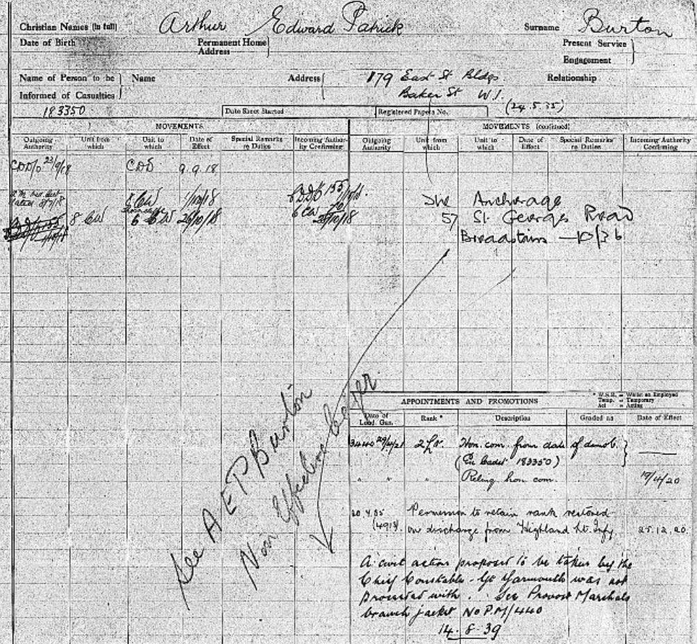 1920 Dec 25. The permission granted to Arthur Edward Patrick Burton to retain the honorary rank of 2nd Lieutenant, which was withdrawn on his enlistment in the Highland Light Infantry, is restored on his discharge.