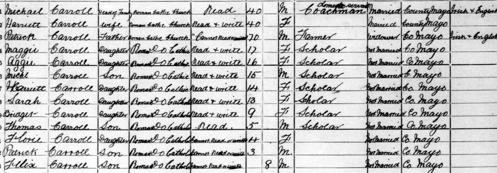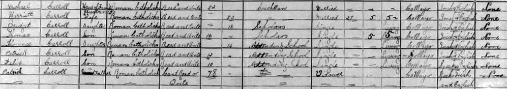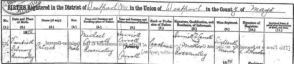 1898 Feb 20. Born Westport, Mayo. Only male child born Westport 1898 with surname Carroll is a Patrick Carrol (vol 4 p445)of the right age born Westport, Mayo in 1911 census and in 1901 census - curiously this is the name that is used in WS0873