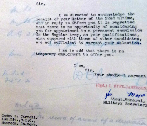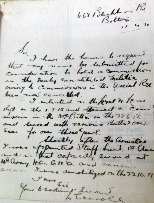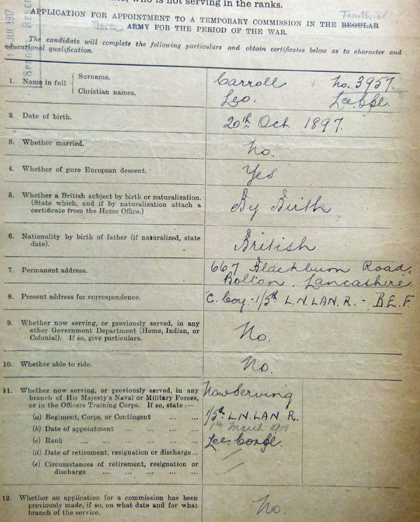 The chap obviously exists and was a Lt in N Lancs Regt. And was serving in J Coy ADRIC. He might be Ernest Leo Carroll b1898 of a Dublin father. 240 Crown Lane Horwich Lancashire (near Bolton and could explain N Lancs Regt.)(contact with a grandson seems to rule him out). Or he might be Patrick Carroll born 1898 in Westport, Mayo - this seems more likely, and he has a father Michael. Either way he did not use his correct Christian name.