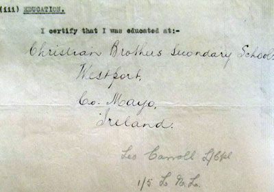 1940 Apr 25. Enlisted in Australian Army as Leo Carroll with a dob of 20 Feb 1905 (sic) and born Westport, Ireland. Enlisted in Albert Park, Victoria. Next of kin Florence Carroll