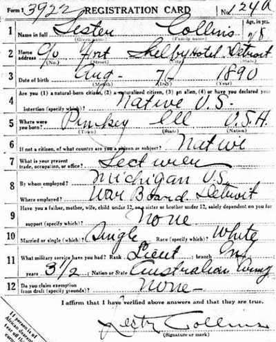 1890 Aug 7 Born New Zealand in RIC. But he appears to have been born Illinois, USA, and he claimed he served as a Lieutenant in Australian Army at some point. It is unlikely that two Lester Collins, both 6ft 1" were born on the same day, given "Lester Collins" is not a common name