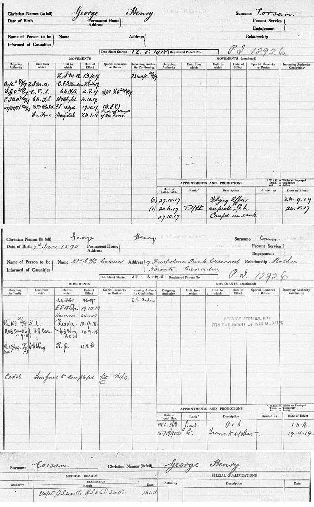 1898 Jan 7. Born Henry George Corsan (a discrepancy between RAF record and Ontario Birth Record - both Jan 7. I suspect he lied to get into army. ) In York Ontario, son of George Hebden Corsan , a fruit peddler and Nora Warren