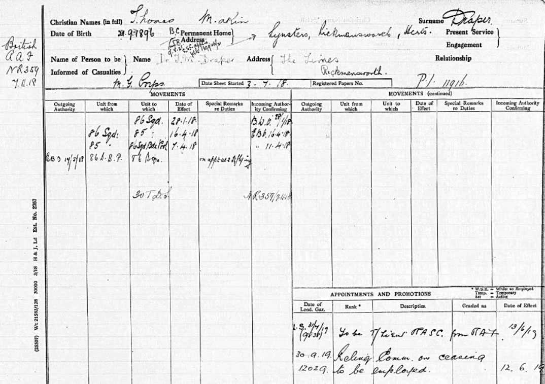 1917 Apr 30. Temp. Lt. T. M. Draper ceases to belong to the Machine Gun Corps on being transferred to R.F.C