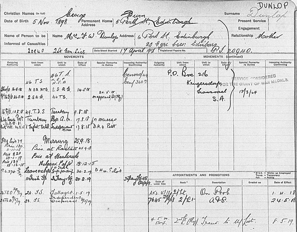 Watsonian War Record: DUNLOP, George Burn, Edinburgh, 1897; youngest son of the late G.B. Dunlop, Edin,; 1906 – 13; O.T.C., 1911 –13; insurance; 9th R.S., Pte. 1914, Sgt. 1916; R.F.C. 1917; France 1915 – 17 and 1918; shot down in Germany while flying with Independent Air Force, and taken prisoner.
