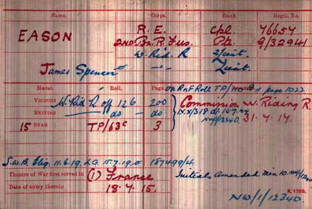 1915 Mar 12 Attested at Mansfield: Pioneer, Royal Engineers Special Reserve (Motor Cyclist Section). His next of kin was his father Samuel Eason, of 80 Harcourt Street, Kirkby in Ashfield, Notts (as in 1911 census). And he was appointed a Coporal