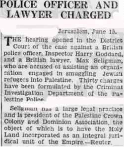 1939 Jun 22. Jewish News Archive "British Police Inspector Harry Goddard was found guilty today of charges that he had helped smuggle Jews into Palestine and was sentenced to probation of two years on a bond of £200. In sentencing him, District Judge Bernard V. Shaw explained that he had taken into account his previous good record and the police methods used in uncovering the smuggling conspiracy."