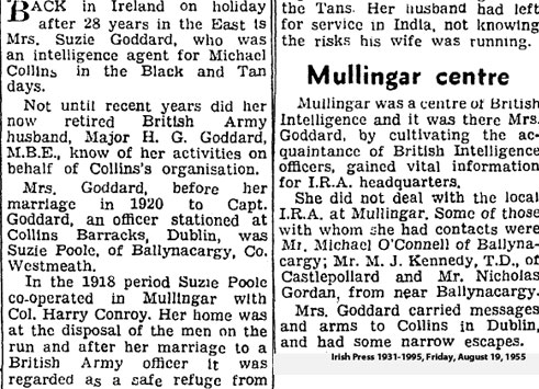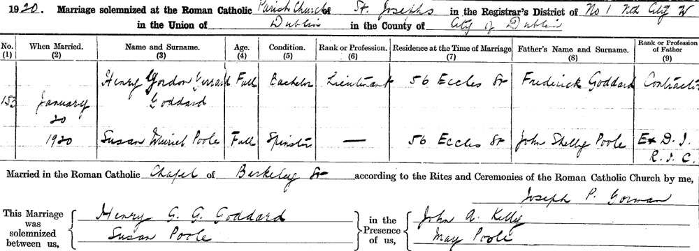 1920 Jan 20 Married in Dublin to Susan Poole. A remarkable woman that may have spied for Collins, and was certainly living with and bearing children with another man in Ireland 1925- 1928 John Leahy (described as 28 years old, from Galway and an ex-British Naval Officer)- she got a suspended 12 month sentence for fraud with this man in 1928 in Ireland, and may have wanted the IRA to kill her husband. Note he did not join ADRIC until after the Truce, in Oct 1921