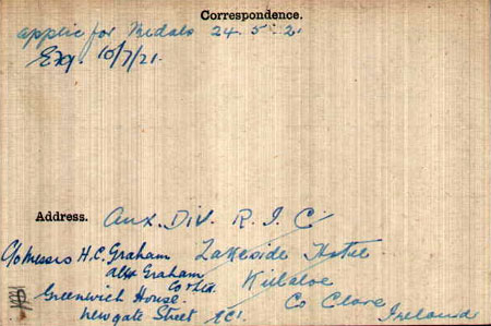 1920 Oct 20 Joined ADRIC with service no 793. Posted to G Coy. Medal Index Card gives his address as: Aux. Div. R.I.C. Lakeside Hotel, Killaloe, Co. Clare, Ireland