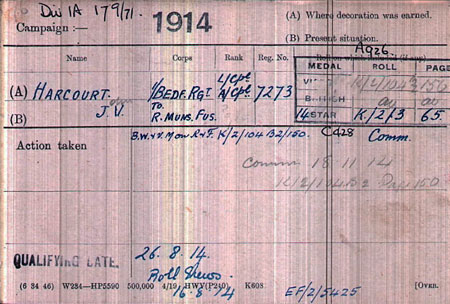 1914 Nov 18 Commissioned 2nd Lt Bedfordshire Reg. He had served 12 years 73 days in the Ranks