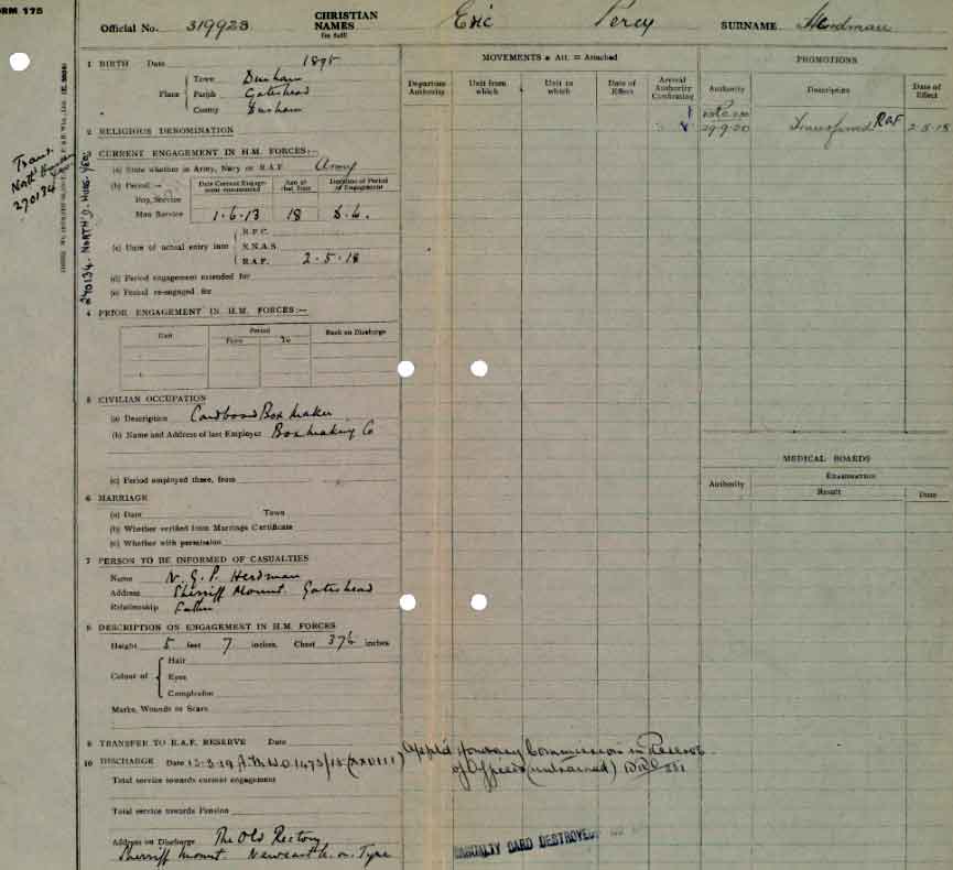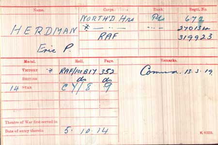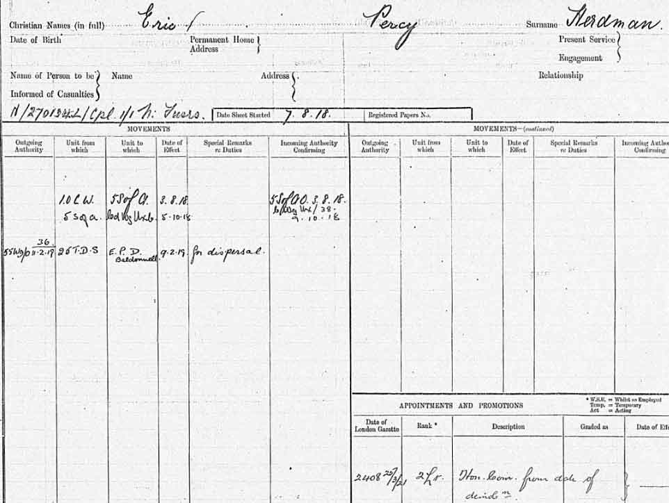1919 Mar 13 Demobilised and commissioned on same day. The undermentioned Cadets are granted Honorary Commissions as 2nd Lt., with effect from the date of their demobilisation: — 270134 Eric Percy Herdman.