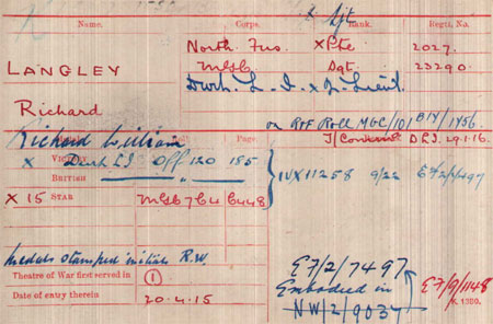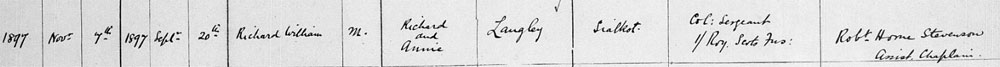 1897 Sep 20. Born in Sialkot, Bengal, India. His father was a soldier and the birth is recorded as a Military Birth in India. Son of Richard & Annie Langley