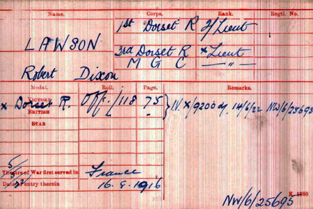 1915 Sep 9. The undermentioned Cadets and ex- Cadets of the Officers Training Corps to be Second Lieutenants (on probation). Dorset Regt. Robert Dixon Lawson