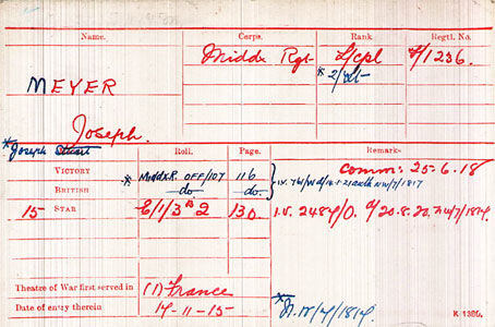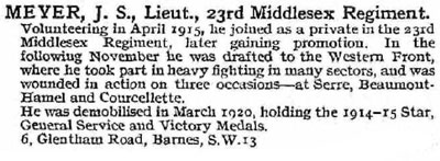 1920 Mar 8. Temp. Lt. J.S. Meyer relinquishes his commission on completion of service , and retains the rank of Lt .
