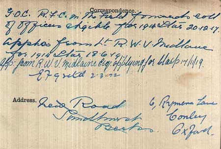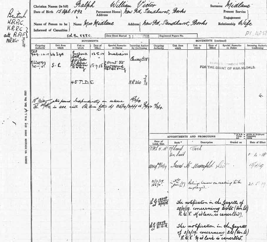 1917 Oct 1. RFC. Asst. Instrs. in Gunnery. (Graded as Equipment Officers, 3rd cl.). 2nd Lt. R. W. V. Midlane, K.R. Rif. C., and to be seed.
