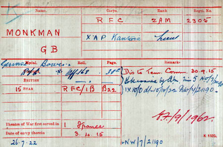 1942 Jul 15. BALLOON BRANCH. Flt. Lts. to be transfd. to the Admin and Spec. Duties Br. : — G. B. MONKMAN (91132).