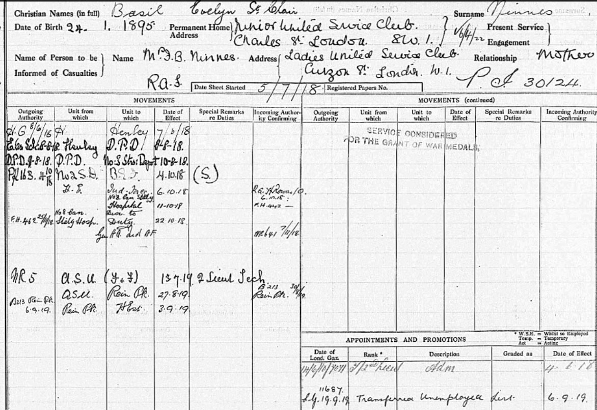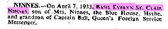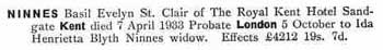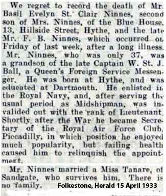 1895 Jan 24 . born Eltham, Kent the second son of Frederick Benjamin Ninnes, a silversmith, and Antonia Frances (nee Ball) Ninnes of 1 Douglas Avenue, Hythe in Kent.