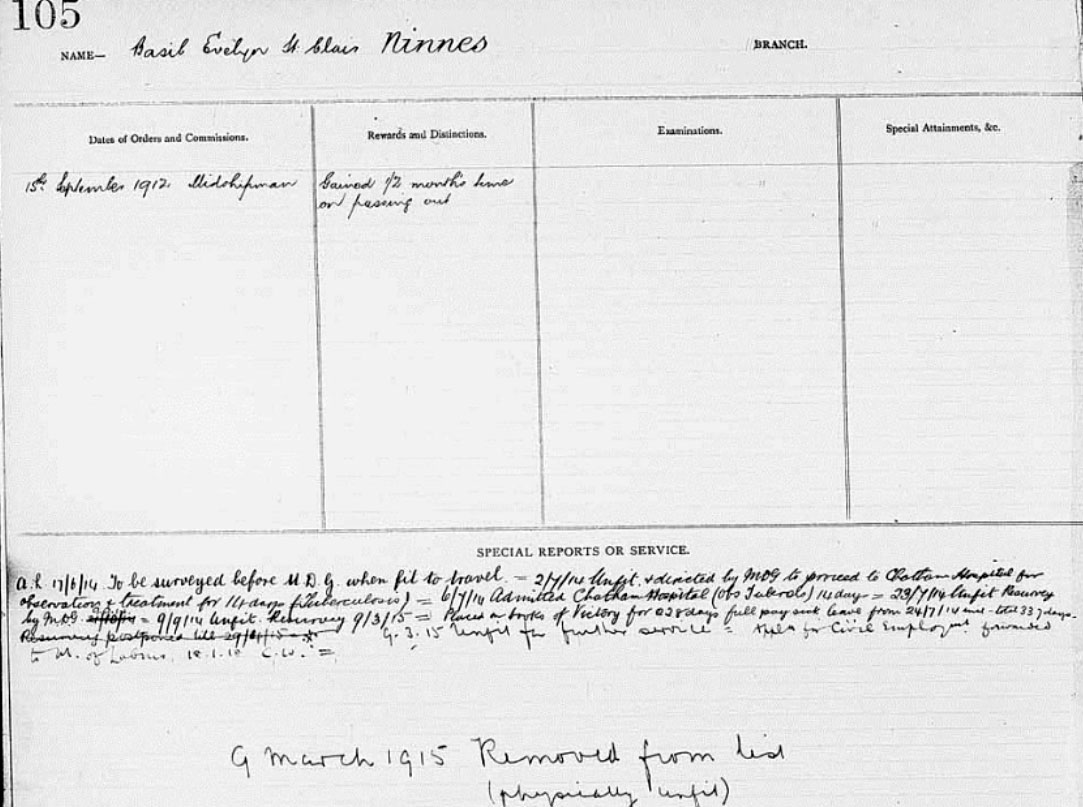 1914 Jul 2. He was taken ill and was admitted to Chatham Hospital on the 6th of July for observation and treatment for suspected tuberculosis. He was invalided out of the Navy on the 9th of March 1915 but later recovered and was commissioned as a 2nd Lieutenant in the Administrative Branch of the Royal Air Force on the 4th of June 1918. He was posted to Henley on the 7th of June and was posted to No.3 Stationary Depot on the 10th of August 1918. He was posted for service in France on the 4th of October 1918. He was injured on the 6th of October and was taken to No.3 Stationary Hospital on the 11th of October. He returned to duty on the 22nd of October 1918. He transferred to the unemployed list on the 6th of September 1919.