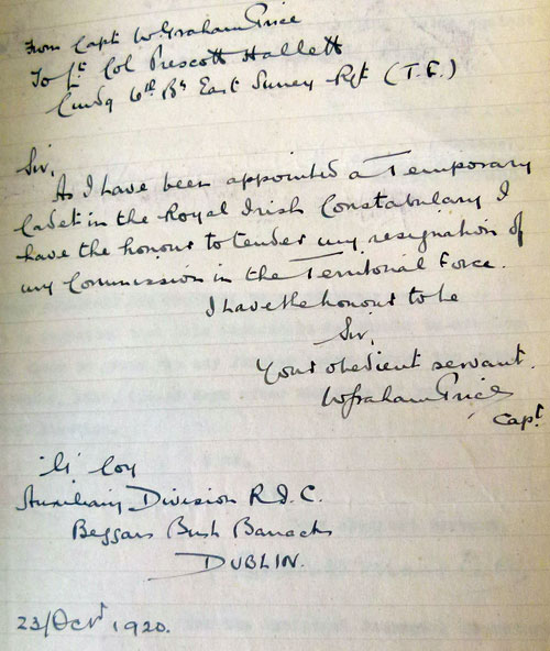 1920 Oct 18. Joined ADRIC with service no 769. Posted Section Leader at G Coy in Clare