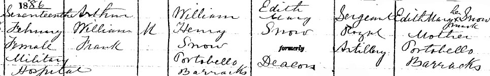 1886 Feb 17. Born Dublin as "Arthur William Frank Snow". He was the son of William Henry Snow born in 1859 in Woolwich in Kent – enlisted in the Royal Artillery on 13 Oct 1877 aged 18 and on 1 Apr 1885 (with permission) he married Edith Mary Deacon who had been born in 1862 in Diltons Marsh, Westbury, Wiltshire. Born in Dublin when his father was in barracks there. Arthur’s next brother Harry Cecil Snow was also born there in 1887 – then they moved to India and two sisters were born. Unfortunately dad William Henry Snow died just 5 days before his last child was born. According to his service records (from findmypast) he died of Enteric Fever on 5 Nov 1891 in Kirkee, Bombay and is buried there. He was a Sergeant. His mother Edith re-married in 1915 to a Thomas H Skelton (from Harry’s service records). His RIC record gives 1890 and Protestant