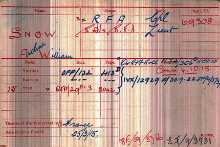 1901 Feb 22 Enlists in RFA (he was 4ft 8in and 15 years old. Mother Edith Snow at 293 Brixton Rd, London (3 Harley Gardens, South Kensington has been crossed out). Younger brother Harry Cecil Snow at R Hib School
