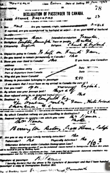 1923 Jan 26. Leaves UK to live in Canada. "Officer" . UK address is with Capt Hemel, Wigginton Lodge, Tamworth