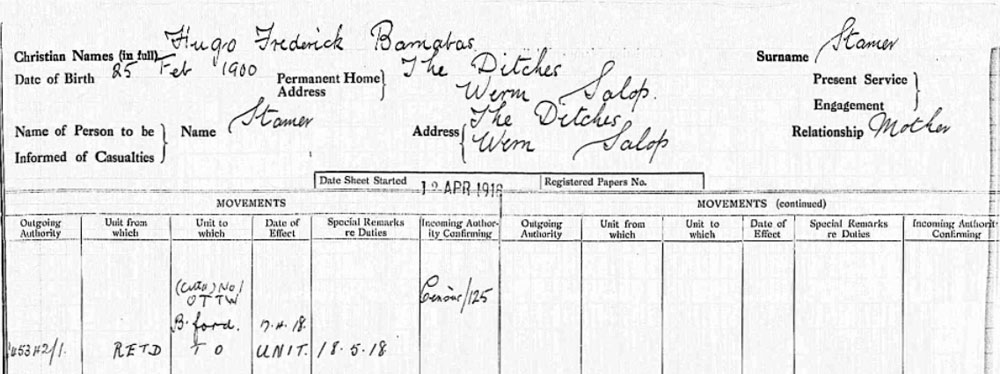 1919 Mar 3. Commission on discharge. N Staffs Regt. Hugo Frederick Barnabas Stamer