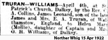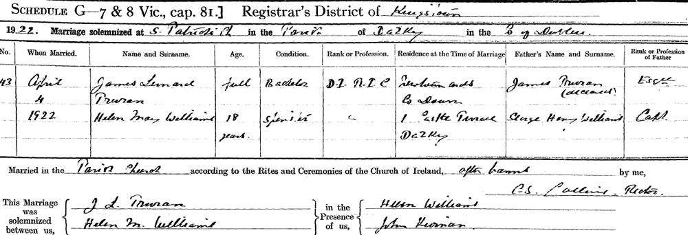 1922 Apr 4. Married Helen May Williams in Dublin. She is the daughter of T/Cadet G H Williams