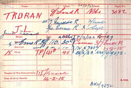 1915 Sep 1. The Essex Regiment. Private James Leonard Truran, from The London Regiment (Queen Victoria's Rifles), to be Second Lieutenant.