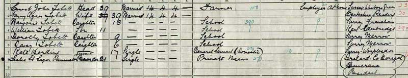 1911 census at Holdhurst Farm, Cranleigh, Surrey as of "private means" aged 21 and a "boarder"