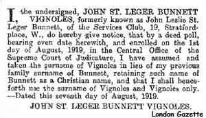 1919 Aug 7. Changes his name to Vignoles - this was his mother's maiden name