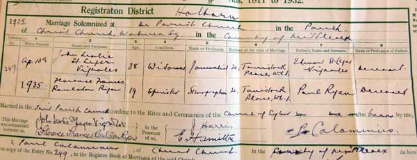 1935 Apr/Jun Married at Holborn, London to Florence F R Ryan. There do not appear to be any children of this marriage