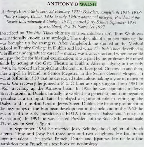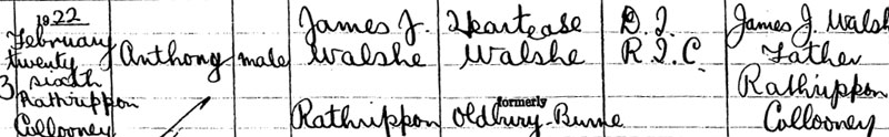 1922 Feb 22 A son Anthony Walsh born Sligo. The son does not have appeared to have stayed with his mother after the divorce and was "brought up by strangers". And would have been only 16 when his father died