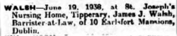 1938 Jun 19. He became ill during a court case in Tipperary Town, and died. Oddly I cannot get a death certificate to see what he died of.