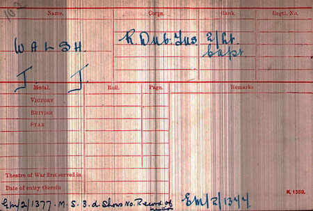 1920 Oct 22. The undermentioned temp. Lts. relinquish the temp. rank of Capt. - J. J. Walsh, Serv. Bn , R. Dub. Fus , on ceasing to be empld. as Adjt. of a Remt. Depot