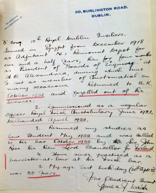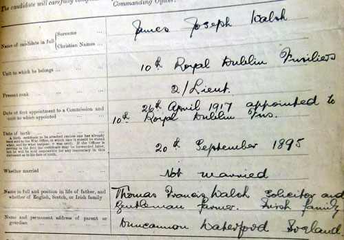 1915 Aug 3. Enlisted in Cork. He was a Bank Clerk living at Lewistown House, Fethard. Father is Thomas Francis Walsh, solicitor