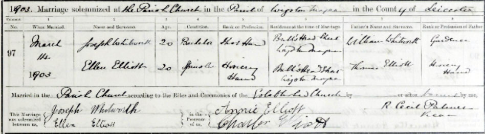 1903 Married in Wigston Magna to Ellen Elliston. He is living in Bulls Head S. His father William is a gardener