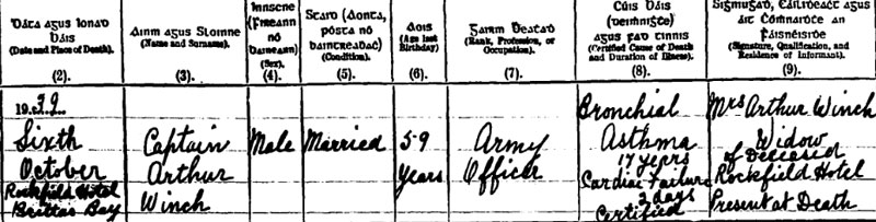 1940 Pension Cards indicate a widow Margaret Lucy who claimed after his death. This was 4 Jan 1940 from Rockfield House , Brittas Bay