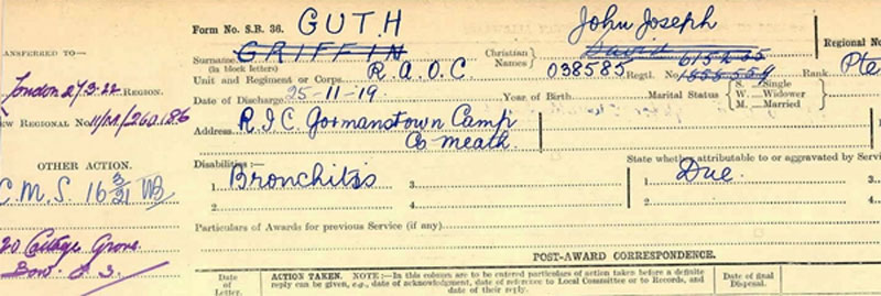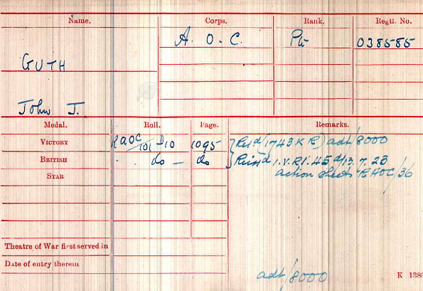 1914 Jan 29 Attested to 5 Dragoon Guards as John Joseph . He was a tailor. Father Edward Guth, 20 Cottage Grove, Bow , London. Mother Jane, siblings Albert and Edward. Oddly 1918 Electoral Roll gives him at that address with Herbert Charles Guth and John George Guth. They dodged around to avoid the German connection, the others by changing their names and their fathers name, but still giving 20 Cottage Grove as their address